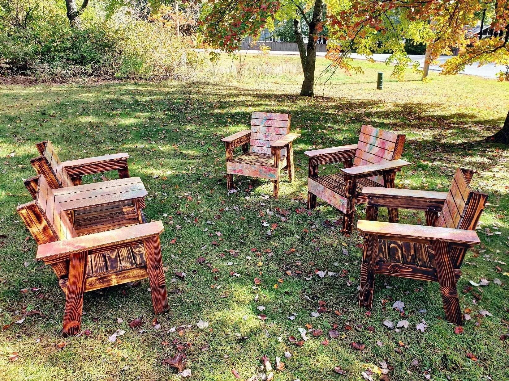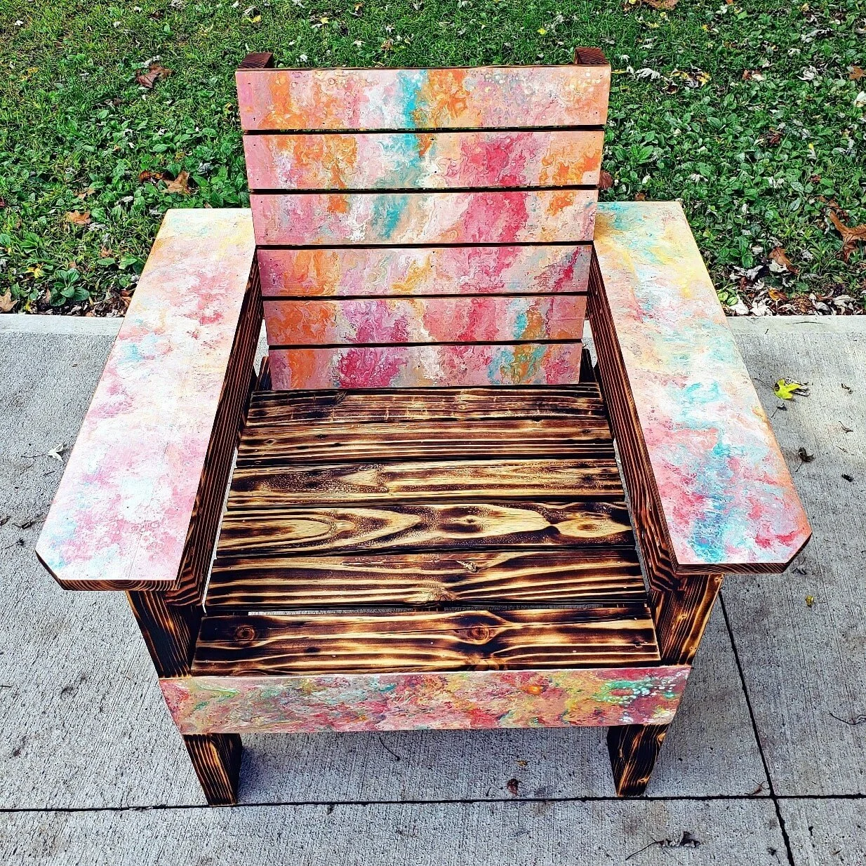This set of Adirondack furniture was finished using the acrylic pour process like the tables above. Because you cannot replicate an item to look exactly the same, each piece is one-of-a-kind.